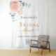 Un fondo blanco chic. Decorado con un floral rosa dorado, flores (rosas) y hojas de eucalipto pintadas con acuarela verde, ramitas, follaje y una ramita dorada falsa. Personaliza y añade el nombre de la futura novia y tu #hashtag de Instagram para el evento. Letras negras y doradas. Se puede usar tanto como pancarta de bienvenida como decoración de pared para la fiesta.