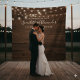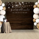 Fondo para cabina de fotos de boda con luces de cadena y madera rústica