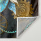luciérnagas de vapor con alas transparentes azules y bombilla verde sobre fondo gastado, marrón y texturado. Estilo Steampunk.