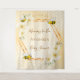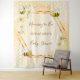 Elegante, divertido, tapiz de ducha de bebé de verano. Fondo amarillo y blanco con un patrón de peine de miel. Con un marco geométrico de oro falso. Decorado con flores tropicales de color amarillo claro, color crema, hibiscos y abejas con burbujas alegres. Con el texto: Mami to Bee y el nombre de la futura mamá. Plantilla para el nombre y una fecha. Se puede utilizar como decoración de pared para la ducha para bebés o como telón de fondo fotográfico.