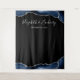 Esta elegante tapicería para cabina de fotos de boda presenta un borde de ágata azul marino y plateado en la parte superior e inferior sobre un fondo negro. Personalízala con los nombres de los novios en una fuente manuscrita gris plateado pálido seguida de la fecha.