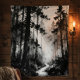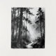 A mesmerizing forest path disappears into ethereal mist, with towering pine trees framing dramatic sunbeams filtering through the fog. This atmospheric black and white ink wash painting captures the mysterious beauty of a woodland trail with flowing watercolor textures and monochrome tones. The composition draws the eye deeper into the serene wilderness, where light pierces through the misty atmosphere creating a spiritual, meditative scene.Perfect gift for hikers, nature photographers, forest lovers, and outdoor adventurers who find solace in woodland trails. This moody tapestry brings the peaceful ambiance of a misty morning hike into any space. Ideal for cabin decor, rustic home aesthetic, dark academia style, nature-inspired offices, or as a meaningful present for camping enthusiasts and wilderness explorers. The atmospheric depth and flowing ink textures create a contemplative mood perfect for bedrooms, living rooms, reading nooks, or meditation spaces.
