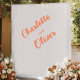 This backdrop is perfect for wedding receptions, photo booths, sweetheart tables, or ceremony spaces. The coral orange text adds warmth and personality, while the minimalist design keeps the focus on the couple.