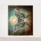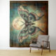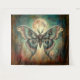 Una gran polilla con motivos intrincados en las alas se despliega de forma prominente en el fondo de una luna llena. Las alas de la polilla son predominantemente verde azuladas y grises con toques de rosa, mientras que la luna es de color amarillo pálido. El fondo tiene un patrón giratorio en verdes y azules mudos, que recuerda a un cielo nocturno. La polilla tiene múltiples ojivas en sus alas, creando una imagen mística y cautivadora.