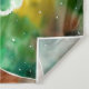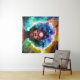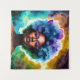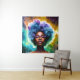El tapiz presenta a una mujer negra de piel marrón llamativa que usa gafas con el pelo afro mezclado con nebulosas contra un fondo de universo galaxy. Obra acuarela de una poderosa mujer de la diáspora africana con un esquema de colores algo cool de azul, púrpura y verde (con un toque de oro cálido encima).