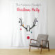 Un tapiz para unas vacaciones, el fiesta de Navidades usó como decoración de paredes fiestas, pancarta de bienvenida y como telón de fondo de una cabina de fotos. Un fondo blanco, decorado con una cabeza de reno abstracta y moderna con una nariz roja. Con adornos navideños, se colgaban de los cánticos. Personalice y agregue su nombre de familia, letras negras. Con el texto: Fiesta de Navidades escrito con una escritura moderna de estilo rojo con letras.