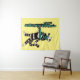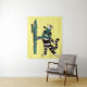 Navidades cactus tapestry con un dibujo de tinta digitalmente coloreado de un encantador personaje de gatito con una flor en la cabeza casi sofocada por un cactus con las mismas flores y unas bolas de Navidades de guirnaldas colgando sobre él.
