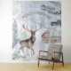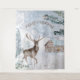 Navidades de renos en madera nevada, con una cabaña de madera y árboles cubiertos de nieve. ilustracion a mano con acuarelas modernas. Feliz texto navideño es personalizable y opcional.