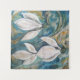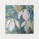 Los mensajeros de primavera, tres flores de nieve sobre un fondo de jardín azul esmeralda, con tonos helados metálicos.