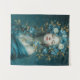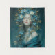 A poetic portrait of a night goddess wrapped in deep blue serenity and abundant flowers.