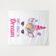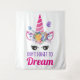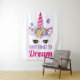 Tapiz con una cita inspiradora que dice: No olviden soñar. Diseñado con un unicornio rosa de moda. Decorado con un elegante cabecero de flores. Unas mariposas extravagantes revoloteando por ahí.