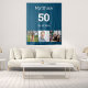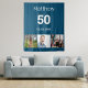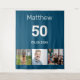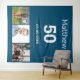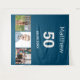 Para una fiesta de cumpleaños de 50 años (o cualquier edad). Un collage de 3 de tus fotos de amigos, familiares, intereses o mascotas. Personaliza y agrega su nombre, edad 50 y una fecha. Fondo azul. Fecha de nacimiento o fecha de la fiesta de cumpleaños. Texto de color blanco.