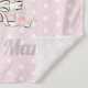 Cute personalizado bebé niña elefante tapiz de pared para el vivero infantil o el dormitorio para niños pequeños. Este adorable elefante pequeño sostiene un globo de plata rosa y purpurinoso y se sienta en una caja de regalo. El fondo es un patrón de puntos de polka blanco sobre rosa. Personalice agregando el nombre de su hijo.