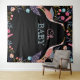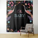 Diseño de tapiz moderno, chic y elegante para baby shower con temática de cigüeña y follaje floral botánico, que presenta un arreglo vibrante y audaz de varias flores, hojas y plantas de acuarela que están bellamente dispuestas para crear un diseño de marco simétrico. Dos hermosas y estilizadas cigüeñas están dispuestas de manera natural dentro del jardín botánico para crear un punto focal en el centro de la pieza, para destacar y resaltar las palabras "Oh Baby". Un fondo negro audaz contrasta hermosamente con los colores florales vibrantes para crear un tapiz llamativo y moderno. Todas las ilustraciones contenidas en este tapiz de baby shower con cigüeña botánica floral son obra de arte original dibujada a mano por Moodthology. Puedes personalizar el tamaño del texto, el color del texto, la fuente y el diseño según tus preferencias de diseño personal.
