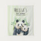 Tela de baby shower con una ilustración adorable en aguarela que muestra a una mamá y un bebé oso panda negro y blanco acurrucados juntos. La mamá sostiene a su cría entre algunos tallos de bambú verde.