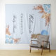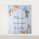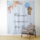 Una alfombra de bienvenida para un baby shower elegante y moderno. Un fondo azul claro decorado con hierba de pampas de estilo boho, flores rosadas doradas y flores azules claras y un oso de peluche niño sosteniendo un globo. Personaliza y añade un nombre.