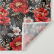 Patrón detallado de acuarela de flores de peonías rojas deliciosas, hojas de peonía, flores de gypsophila blancas pequeñas, contornos de formas geométricas doradas sobre fondo oscuro