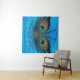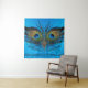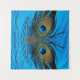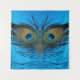 Cara de pájaro creada a partir de imágenes de plumas de pavo real reflejadas en un fondo metálico azul.