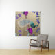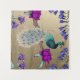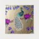 Un pavo real colorido está encaramado en una rama adornada con flores vibrantes. El fondo tiene un tono dorado con detalles texturados, realzando la elegancia general de la escena.