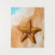 Tapiz en un ilustracion acuático de una estrella de mar con detalles texturados, descansando en una playa de arena con olas suaves y un salpicón de azul océano. La mezcla de tonos cálidos y agua fría le da un ambiente relajado y de playa.