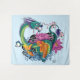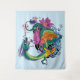 Un dragón de agua verde y púrpura chino con un pez koi naranja, flores de loto, flores de cerezo en flor de agua contra un fondo azul