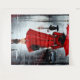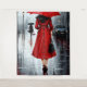 pintura de una mujer caminando en la lluvia con paraguas rojos