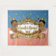Diseño de fondo de bloque de color rosa y azul elegante con destellos dorados que presenta a un adorable príncipe y princesa afroamericanos con coronas de oro en un marco dorado elegante. Todo el texto es editable. Ideal para (niño y niña) gemelos en baby shower o cumpleaños número 1 de gemelos niño y niña ©2022 Diseños de Fiesta Miss Sassy