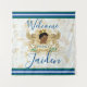 Adorable Príncipe Africano que lleva una corona de oro en la cresta elegante de un león dorado. Borde de franja de polo en la parte superior e inferior del telón de fondo. Monograma personalizado de guión elegante Ideal para ducha de bebé o cumpleaños del Príncipe Real ©2021 Diseños de Fiesta Miss Sassy