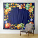 Prop de fondo de foto o fondo de foto. Calabazas, hojas, uvas, frutas y nueces elegantes y bonitas forman un marco de acuarela. Utilice para fiestas de Halloween, Acción de Gracias, Festival de la Cosecha, Fiesta de Trunk of Treat o Friendsgiving. Pida a los invitados que se paren frente a este fondo de Cosecha de Otoño y úselo para tomar fotos de selfie o fotos grupales. Fondo azul oscuro.
