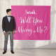 Letrero de propuesta de matrimonio para novia con un nombre diseñado en colores blanco y rosa caliente. Fondo con la pregunta "¿te casarás conmigo?" en blanco.