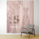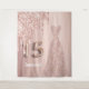 Elegante, clásico, glamuroso y de estilo jovial para una fiesta de cumpleaños de Quinceañera. Un vestido rosa de oro con un falso oro rosa y goteo de purpurina rosado, pinta goteando. Fondo Subió de gradiente dorado. Personaliza y agrega su nombre. El número 15 se escribe con un tipo de letra de estilo globo. Se puede utilizar como cartel de bienvenida, decoración de paredes fiestas y telón de fondo de una cabina de fotos.