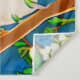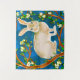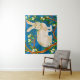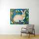 Tapiz en un ilustracion de conejo salvaje, rodeado de ramas de árboles floridos, contra un fondo azul oscuro del denim