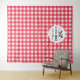 En la ducha de la pareja de la fiesta de compromiso I Do BBQ, podrás tomar selfies frente a este tapiz de yegua de color rojo y blanco, con el monograma de parrilladas de la pareja y sus nombres.