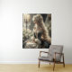 A woman in an opulent, baroque-style gown adorned with intricate lace and pearls sits gracefully on a luxurious throne. Her long, wavy hair cascades down her back, complemented by elaborate jewelry including earrings and a necklace. The setting is richly decorated with white tulips, a chandelier, and ornate drapery, evoking a sense of grandeur and historical elegance.