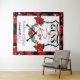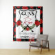 Tela de fondo para revelación del género de armas o rosas para Baby Shower. Rojo, negro y blanco. Rosas rojas encima de un marco en forma de insignia con agujeros de bala alrededor del marco de rosa exterior. Ideal para parejas militares o de fuerzas del orden. ©2022 Diseños de fiesta de Miss SassyParty