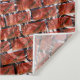 Estampada en color rojo claro, con aparentes burbujas en efecto de rallado o inclinación, pero la imagen que parece burbujas está debajo de otra imagen semitransparente. Con efecto de ilusión que puede causar la percepción de algo metálico iluminado o brillante.