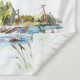 Tapiz con escritura de cita inspiradora representa un paisaje acuático simple que incluye una casa en el lago con árboles y hierba marina. Presenta una motivadora Biblia cristiana Verse Romans 15:13, "Que el DIOS de la ESPERANZA te llene de ALEGRÍA y PAZ mientras confías en Él".