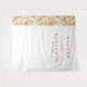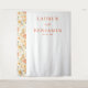 This elegant wedding backdrop features a vertical layout with a lush floral pattern on the left, showcasing peach, orange, cream, and green flowers in a vintage-inspired style. The right side offers clean white space with customizable text in a mix of bold serif and cursive fonts, creating a balanced and romantic composition. Perfect for adding a touch of nostalgia and serenity to your special day, this design combines detailed botanical illustrations with modern typography to celebrate love and unity.
