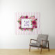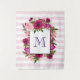 Un tapiz monogramado con un ramo de flores compuesto por rosas rosa claro y adornos rosados oscuros con muchas hojas verdes exuberantes. Un marco sobre la parte superior para poner su monograma personalizado dentro. El fondo es una suave tónica rayada rosa pastel.