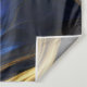 Este patrón presenta una impresionante fusión de azul real y oro, magistralmente entrelazado para formar un patrón de giro abstracto que cautiva el ojo. Esta composición dinámica tiene una calidad orgánica, que recuerda a los paisajes naturales, donde las líneas y curvas que fluyen sugieren las suaves ondulaciones de las colinas y los valles. La interacción de los colores se ve reforzada por la inclusión de hermosos tonos metálicos iridiscentes que brillan y cambian con la luz, creando una experiencia visual fascinante. Esta imagen se genera IA.