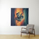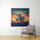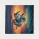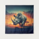 Un rinoceronte majestuoso se alza frente a una puesta de sol vibrante, con formas geométricas intrincadas. La sabana africana se extiende detrás, salpicada de acacias.
