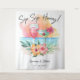 Tema tropical de parejas en la ducha, compromiso o fiesta de boda con telón de fondo con una puesta de sol en la playa con acuarela, cócteles, flores de hibisco y hojas de palmera con una leyenda 'Sip Sip Hurra' en escritura a mano. Perfecto para celebraciones con tema de playa, verano, costa, luau y tiki.