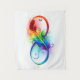 Símbolo de infinito dibujado artísticamente con una hermosa pluma arco iris sobre fondo blanco. Estilo tatuaje.