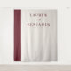 This wedding backdrop features a minimalist design with an asymmetrical layout, divided into two sections by a bold maroon vertical band on the left and a soft cream background on the right. The typography is elegant, using uppercase serif fonts for the names and a smaller size for the date, creating a sophisticated and timeless look. The color palette of deep maroon and creamy white evokes classic elegance, perfect for formal occasions. The clean lines and lack of additional motifs emphasize clarity and focus, making it ideal for capturing memorable moments in a contemporary yet traditional setting.