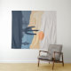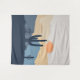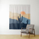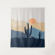 Desierto mexicano al amanecer ilustracion con sol, montañas y cactus decoración en tonos azul marino, naranja, azul y beige sobre fondo gris pastel