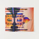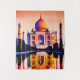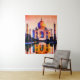 Tapiz en un ilustracion del Taj Mahal, reflejado en el agua, y respaldado por un cielo atardecer naranja de coral profundo