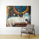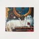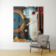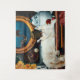 Gato de vapor de peluche blanco con su lindo sombrero de top marrón y gafas. El gato está sentado en un mostrador de la cocina del barco esperando su hora de té. Detrás de él está la ventana del barco que tiene un pulpo pasando.