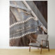 Telón de fondo colgante de caballos al estilo antiguo y rústico para cabina de fotos de boda. Diseño impreso de arte ecuestre de rodeo marrón rústico. Imagen copyright Marg Seregelyi Photography.