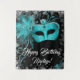 Telón de fondo de fiesta de cumpleaños de máscara azul turquesa con hermosa máscara de masquerade sobre un fondo bokeh bonito. Este telón de fondo de fiesta de máscara es fácilmente personalizable con el texto de su elección. Puede cambiar el color del fondo y del texto.