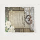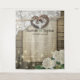 Plantillas de telón de fondo para cabina de fotos de boda con estilo rústico de campo - Pareja con herradura antigua con corazón y lazo de cuerda con nudo y encaje blanco, flor de hortensia, luces de cuerda y tela de arpillera sobre fondo de madera de granero antiguo.
